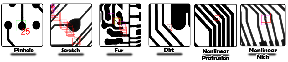 To determine defect by user's parameters and system embedded logic. Simple for operation and no need reference required. Inspect irregular broken/connection, pinhole, dirt, protrusion, violate minimum line/space width etc.