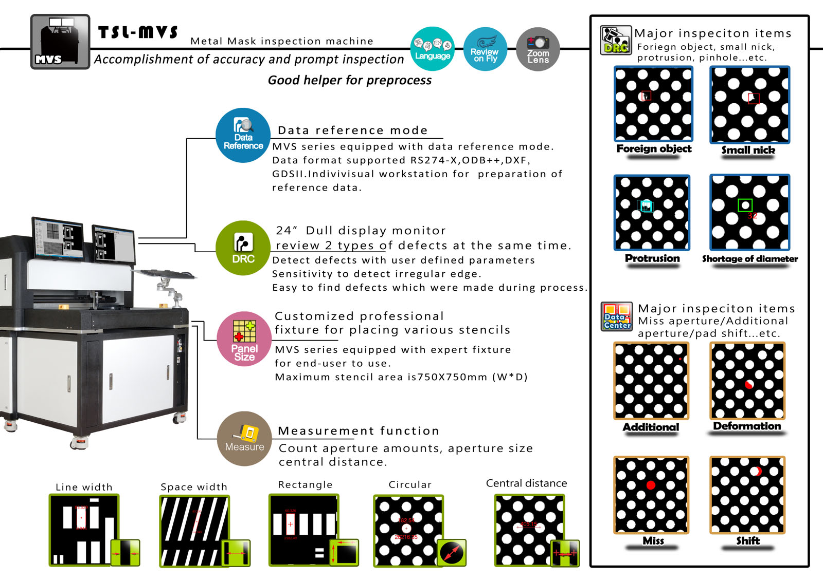 Inspect defects on the metal mask/stencil by optical lens capturing system. The inspection system can reduce damages and promote product quality. With adjustable magnification lens, you can adjust the magnification for different specifications of the sample, the application is more extensive.