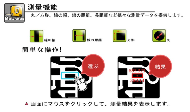 マウスでボックス選択して測量することができます。測量方法は簡単。円形/正方形/線幅線距離/長距離測量などが測量可能。
