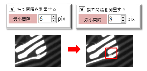リアルタイムでパラメータ反応:パラメータ変更後、新パラメータはリアルタイムで映像に反応され、欠陥が検出されます。使用者は、左下の図のように、リアルタイム撮影画面を見て、パラメータを直接調整し、パラメータ反応後の検出欠陥を見ることができます。パラメータ調整の時間を節約ことができ、最短時間は5分以内です。