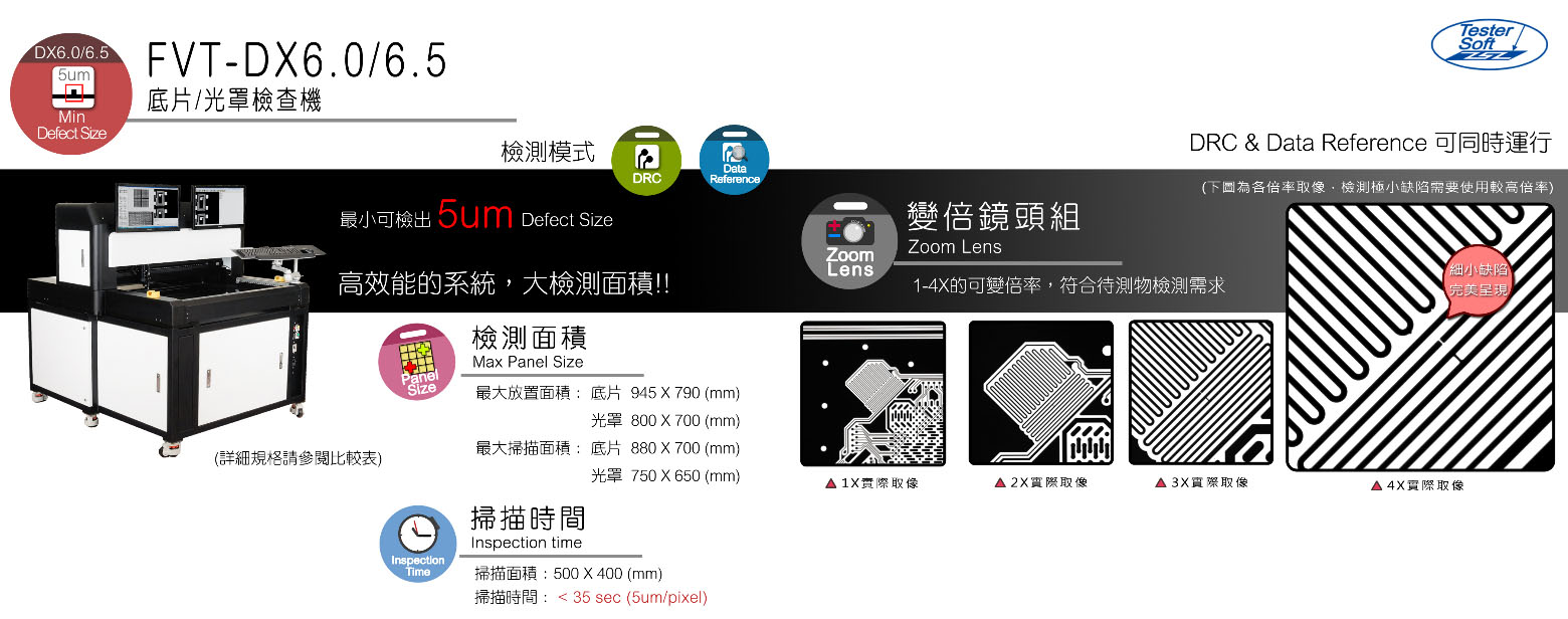 高效能系統,大檢測面積;可變動倍率鏡頭組,對應不同檢測需求。最小可檢5um缺點。